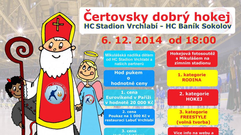 Milé, maminky, milí tatínkové, super holky a kluci, přijďte si užít prima čertovskou a hokejovou atmosféru k nám na zimní stadion. 06.12.2014 od 18:00 hod hraje náš tým se silným soupeřem ze Sokolova, takže se budeme mít na co dívat. Tatínkové, vemte maminky a děti, ať i oni si jednou vychutnají hokejovou atmosféru a společně s námi zafandí našim hokejistům!!!!!!!!!! Nezapomeňte na čertovské růžky a pomozte vytvořit pekelnou atmosféru u nás v kotli a zaplnit ho tak, jak jsme ještě neviděli. Zároveň jsme pro vás všechny připravili fotosoutěž, jejíž podmínkou je vyfotit se na ZS s čertem a Mikulášem a to buď jako rodina a nebo jako skupinka v hokejových dresech a nebo vytvořit si nějaký freestyle. Každá kategorie bude mít svého vítěze, o kterém rozhodneme my všichni. Fotografie totiž budou dány na FACE HC STADION VRCHLABÍ a všichni budeme hlasovat. Kdo bude mít nejvíce "like", ten vyhrává. A ceny budou opravdu zajímavé. Pro kluky a holky je připravena také mikulášská nadílka, určitě budete spokojeni s nadílkou od HC a našich partnerů. Samozřejmě nebude chybět ani hod pukem, ke kterému se rovněž váží pěkné ceny. Tak co, přesvědčili jsme vás? Jestli ano, budeme se těšit s vámi všemi na viděnou:-)