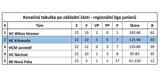 Juniorka postoupila do nadstavby o postup do ligy juniorů – konečná tabulka po základní části: