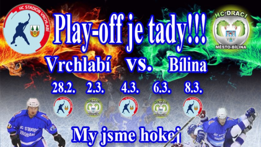 Po základní části se v prvním kole potká páté Vrchlabí s dvanáctou Bílinou. Celky od sebe dělí 23 bodů. Vrchlabí ze třiceti dvou zápasů získalo 58 bodů a to za dvacet výher (z toho 16 v základním čase) a dvanáct proher (z toho dvě v prodloužení a jeden zápas byl kontumován). Draci si vybojovali třicet pět bodů, 12 x zvítězili (9 x v základním čase) a 18 x prohráli (dva zápasy byly za bod v prodloužení). Skóre týmů je u Vrchlabí 136:126 a u Bíliny 112:147. V základní části vyšla ze vzájemných utkání lépe Bílina, doma porazila Vrchlabí na samostatné nájezdy 5:4 a ve vrchlabské aréně zvítězila 3:1. „V základním kole jsme sice Bílinu neporazili, ale play-off je jiná soutěž, tady už se na základní část nehledí,“ komentuje nadcházející zápas kapitán domácího týmu Jiří Jakubec. „Jsem si jistý a věřím, že první kolo play-off vyhrajeme, úplně ideální by bylo, abychom to příští středu doma ukončili a už se připravovali pravděpodobně na Kolín.“Z důvodu velké marodky Vrchlabí neodehrálo poslední kolo, hráči se doléčovali z chřipek a nachlazení. „Ve čtvrtek se po marodící pauze sejdeme na ledě, abychom se zase nadýchli ostrého vzduchu a lehce si zatrénovali. Předpokládám, že pro nás trenér připraví něco zahřívacího, abychom se už v pátek obuli do plné přípravy, a v sobotu nastoupíme na Draky v plné síle. Nesmíme zaváhat, měli jsme teď trochu prostor si odpočinout a srovnat si i hlavu. Hokej a play-off zvlášť je hodně o psychice. Musíme zapomenout na útlum a nezdary, které jsme měli a do dalších zápasů se řádně připravit. Škoda, že nepřijedou jiní draci, hrát play-off s Trutnovem – to by byla atmosféra. Ale my věříme, že naši fanoušci tu atmosféru vytvoří i proti Bílině,“ říká kapitán.
