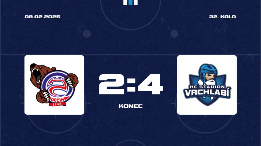 VrchlabíČervinka si připsal první zákrok hned v úvodu zápasu. Ve 3. minutě získal puk Chrtek, Skokan ale zasáhl betonem. V čase 3:13 už to bylo 1:0 pro Děčín, a to díky Pavlovi PÍSAŘÍKOVI. Poul šel sám na Skokana, ale nebyl úspěšný, stejně jako Nowák na druhé straně. V čase 8:39 vstřelili domácí další gól. Náskok navýšil David TŮMA, který dostal trefnou přihrávku. V 11. minutě byl vyloučen domácí Tůma, a Vrchlabí využilo přesilovou hru. V čase 10:41 snížil Štěpán TUREK. Ve 13. minutě mohl skóroval Faigl, ale bylo to těsně mimo. V 16. minutě byl vyloučen vrchlabský Poul, následoval ho po chvíli děčínský Smola. Ani jeden tým v přesilové hře nijak neohrozil brankáře. Nakonec se ale povedlo prosadit HC Stadionu, a to v čase 19:43, kdy na 2:2 vyrovnal Filip MONÍK.