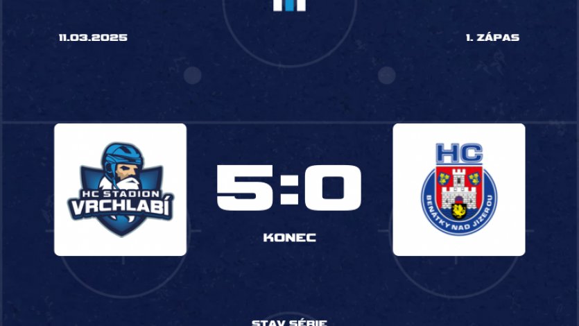 Třetí třetina pro Benátky nezačala dobře. Hned v úvodu byl vyloučen Zumr, a tento přešlap byl potrestán v čase 41:41, kdy se za HC Stadion trefil Tomáš BLÁHA. Následně byl ale vyloučen Hebek. I toto oslabení Vrchlabí zvládlo. Král měl velké štěstí ve 47. minutě, kdy se před branku postavil Gurjevskij a puk se do sítě nedostal. Hruška se snažil dostat přes Tatara, ale nebyl úspěšný. Proti Královi to zkusil Mrňa, puk skončil na rameni vrchlabského gólmana, který je prozatím v zápase 100% úspěšný. Ve 49. minutě byl vyloučen hostující Chalupa. Netrvalo dlouho a přišla další dvě vyloučení, Kerekanič i Pejchal dostali oba po pěti minutách a hostující hráč navíc dvě minuty za hrubost. Král pak vychytal hostující hráče, kteří na něj najížděli. V 53. minutě byl vyloučen Šafránek, hosté již byli ve čtyřech na ledě, když šel na trestnou lavici ještě Kliment. V čase 54:28 vstřelil pátou branku domácích Filip MONÍK. Domácí se ještě pokusili o gól v 57. minutě, Brázdil si ale svatyni pohlídal. Znovu přišel trest na obou stranách, a to dvě minuty před sirénou. Chrtek si šel na trestnou lavici sednout v 59. minutě. Král ukázal skvělý zákrok o chvíli později. Hozák nahazoval před branku, kde stál Machač, puk ale skončil v ochranné síti. V prvním zápase osmifinále si tak bod připisuje vrchlabský celek.