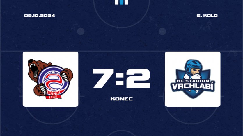Další vyloučení přišlo hned po 12 sekundách hry, tentokrát na domácí straně. Vrchlabí zkrácenou výhodu nevyužilo, hostům se nedařilo dostat se do pásma a vymyslet nějakou akci. Navíc děčínská obrana perfektně fungovala. A svou pozici si Medvědi upevnili v čase 46:21, kdy přidal pátou branku Tomáš NEZBEDA, který puk dorazil za Červinku. Medvědi se dostali na koně, a další gól na sebe nenechal dlouho čekat. V čase 50:38 to byl znovu Tomáš NEZBEDA, který se prosadil. Červinka se jen ohlédl za pukem. V 52. minutě byl vyloučen hostující Hladík, o necelé dvě minuty později se přidal děčínský Smola. Pro HC Stadion pak přišla další zkrácená přesilová hra, hosté ale Lavingera nijak neohrozili. Sedmý gól do vrchlabské branky padl v čase 56:59 z hole Davida TŮMY, který neměl problém překonat Červinku. Na konci utkání byl ještě vyloučen vrchlabský Tatar, ale Medvědi už nic nestihli.