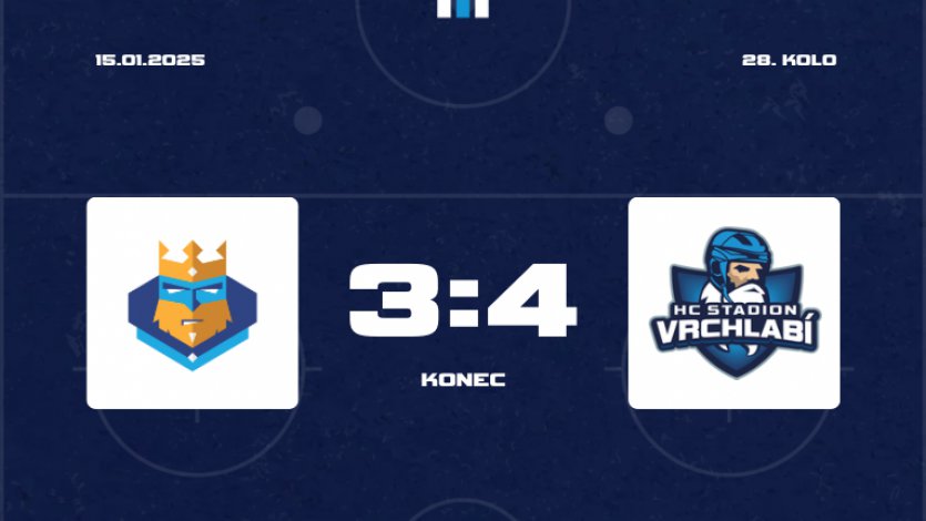 VrchlabíÚvod zápasu patřil hostujícímu týmu. O první úspěšnou střelu se v čase 1:36 postaral David CHALUPA, který se trefil hned po vyhraném buly. Ve 4. minutě našel Šulek Bártu, ten se sice dostal do útočného pásma, ale Král ho vychytal. I další pokusy Písku byly proti brankáři marné, o střelu se pokusil Marcilis nebo Radoš. Na druhou stranu v 9. minutě mířil Šlaicher, ale puk skončil v ochranné síti. Další možnost měl tento hráč v 11. minutě, ale gólman Písku byl připravený. Ve 13. minutě přišlo první vyloučení zápasu, a to na straně Písku. Bohužel HC Stadion výhodu nevyužil. Pitel se rozjel sám na Krále v 15. minutě, ale brankář zachránil svůj tým. V čase 15:13 už to ale bylo o dvě branky, a to díky Lukášovi KASTNEROVI, který Šatného překonal střelou z pravé strany. Do konce třetiny už Písek nestihl gólově reagovat.