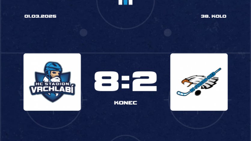 Třetí třetinu začali lépe domácí hráči. Sice se k puku dostal Vašíček, který trefil jen lapačku Červinky, nicméně pak už to bylo v režii Vrchlabí. V čase 43:18 vstřelil čtvrtý gól Michal MACHAČ, kterého našel Chrtek. Tatar trefil pouze náruč Koláře. Na druhé straně Červinka zachytil pokus od Krutiny. Ve 48. minutě Klíma ujel na Červinku, ale domácí brankář byl pozorný. V čase 47:26 si hattrick připsal Štěpán TUREK. Tatar přihrával Jirků, ale Kolář ho vychytal. Prošek se dostal do samostatného úniku, ale Červinka ukázal skvělý zákrok. V 51. minutě byl vyloučen domácí Poul, a také Cheb se prosadil v přesilové hře. V čase 51:03 Šimon KRUTINA překonal Červinku a snížil na 1:5. Kolář se v 54. minutě ukázal jako skvělá opora týmu, když se roztáhl na brankové čáře. Poté byli současně vyloučení Vápeník a Tatar za hrubnost. Machač trefil prostor mezi betony, ale puk v síti neskončil. Kolář musel blokovat střelu od Bláhy i Turka. Dalšího gólu se HC Stadion Vrchlabí dočkal v čase 55:39, znovu z hole Štěpána TURKA. Netrvalo dlouho a bylo to o šest branek. V čase 56:42 si připsal gól Filip MONÍK, který ujel po pravé straně. V čase 57:36 přišla střela od Martina KOZÁKA, který využil prostor na brankovišti a překonal Koláře střelou mezi betony. Také Cheb ale dokázal vstřelit branku, a to v čase 58:19, kdy upravil skóre Šimon KRUTINA. Domácím se povedlo vstřelit ještě devátou branku, nicméně ta neplatila kvůli postavení Poula v brankovišti. Zápas tak skončil výsledkem 8:2 pro domácí Vrchlabí, které si připsalo další body do tabulky.