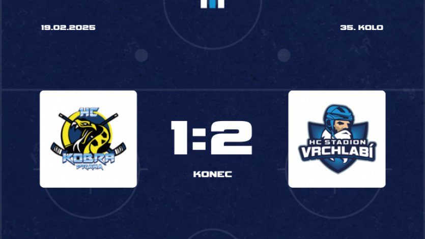 VrchlabíVlček dostal přihrávku, ale puk skončil v obranném pásmu. Hladík pak nahazoval kotouč do útočného pásma, ale nikdo ho netečoval. Ve 3. minutě se konečně dostali k puku domácí hráči. V 5. minutě se ve velké šanci ocitl Šteiner, který se dostal do přečíslení. Král si pohlídal střelu mezi betony. Vlček nahrával Stejskalovi, ale ten nezpracoval puk. V 9. minutě se dostal k puku Tatar, ale Ondrík ho vychytal. V 11. minutě přišlo první vyloučení v zápase, a to na straně Kobry Praha. Ve 13. minutě se do přečíslení dostal Davídek, který poslal přihrávku Petrákovi. Toho ale Král vychytal a změnu stavu nepřipustil. Poté byl vyloučen také hostující hráč. HC Stadionu se podařilo oslabení zvládnout, a navíc se jako první radovali z gólu. V čase 16:59 otevřel skóre utkání Ondřej CHRTEK, před kterým byla poloodkrytá branka. Kobra se snažila odpovědět vyrovnávací brankou, ale gólman Vrchlabí byl vždy připravený.